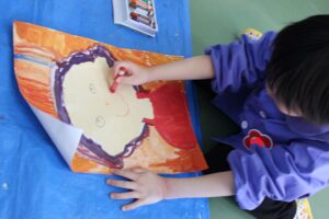 「白・茶・青・赤・黄」を混ぜ、一人一人違う肌の色を作り「大切な人(家族)の似顔絵」に挑戦!絵画活動は楽しいだけではなく、子どもの情緒を安定させ、指先や脳の発達を促す効果が期待できます。また、子どもにとって大切な想像力や認知能力、観察力などの能力を伸ばすことにもつながります。