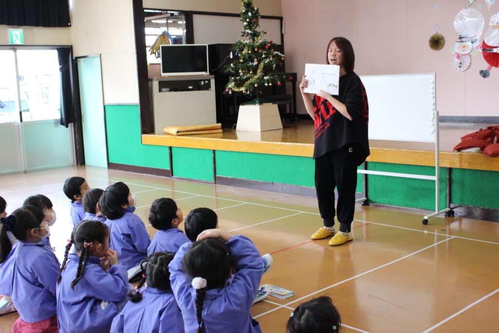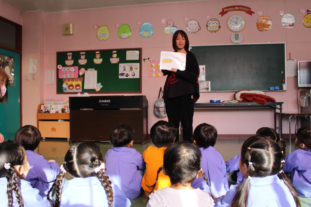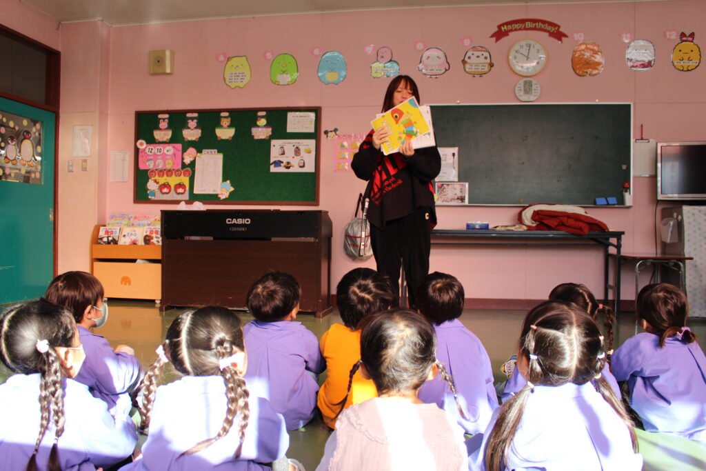 最初に、かわいいカメレオンがたくさんの色に大変身する絵本を見ました👀赤や青、黄色など中国語で何というのか教えていただき、発音の練習をしました。