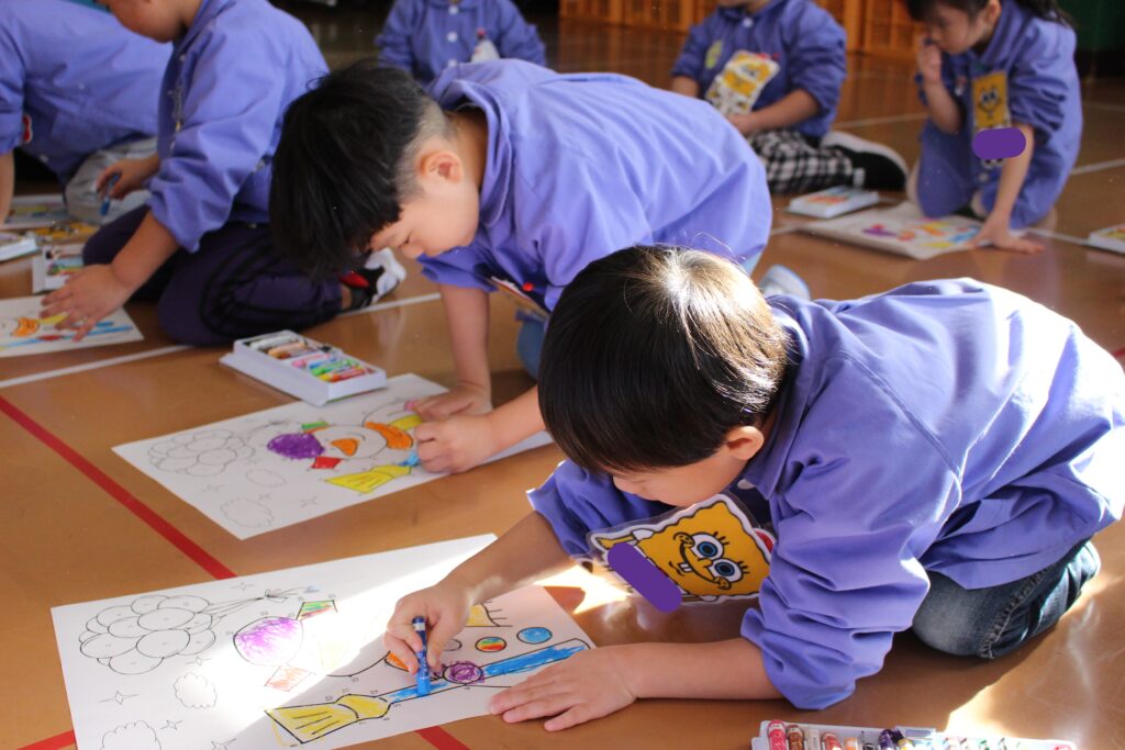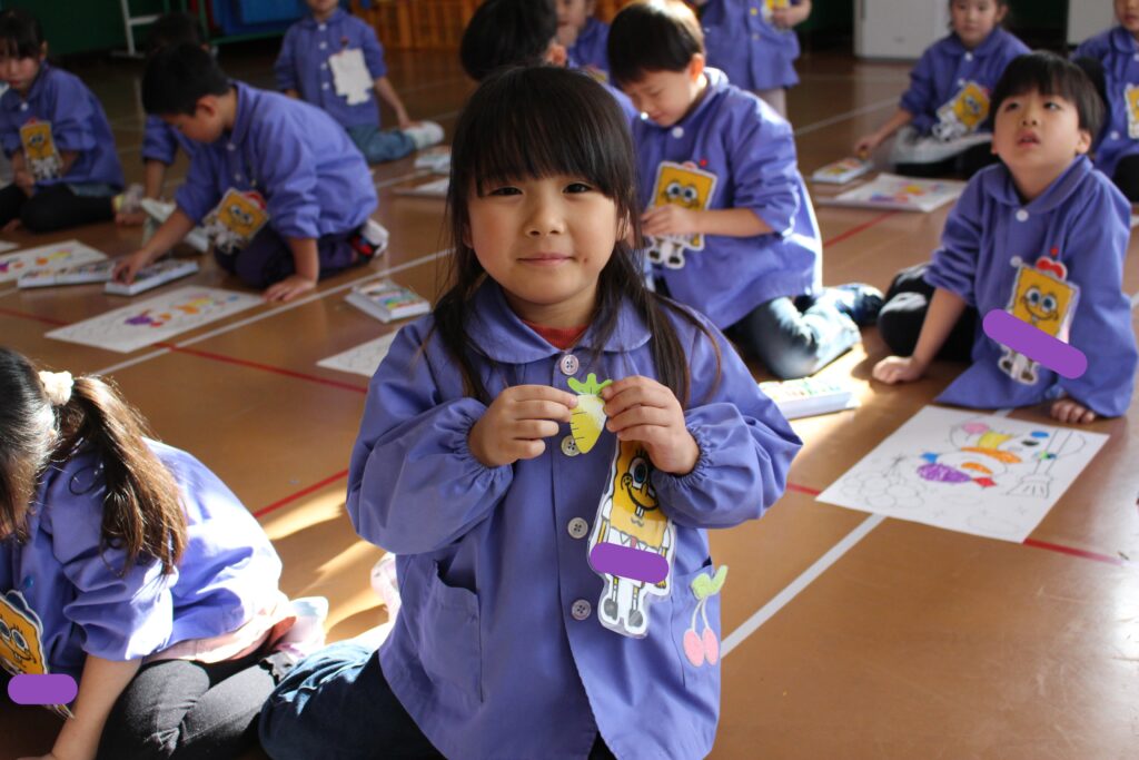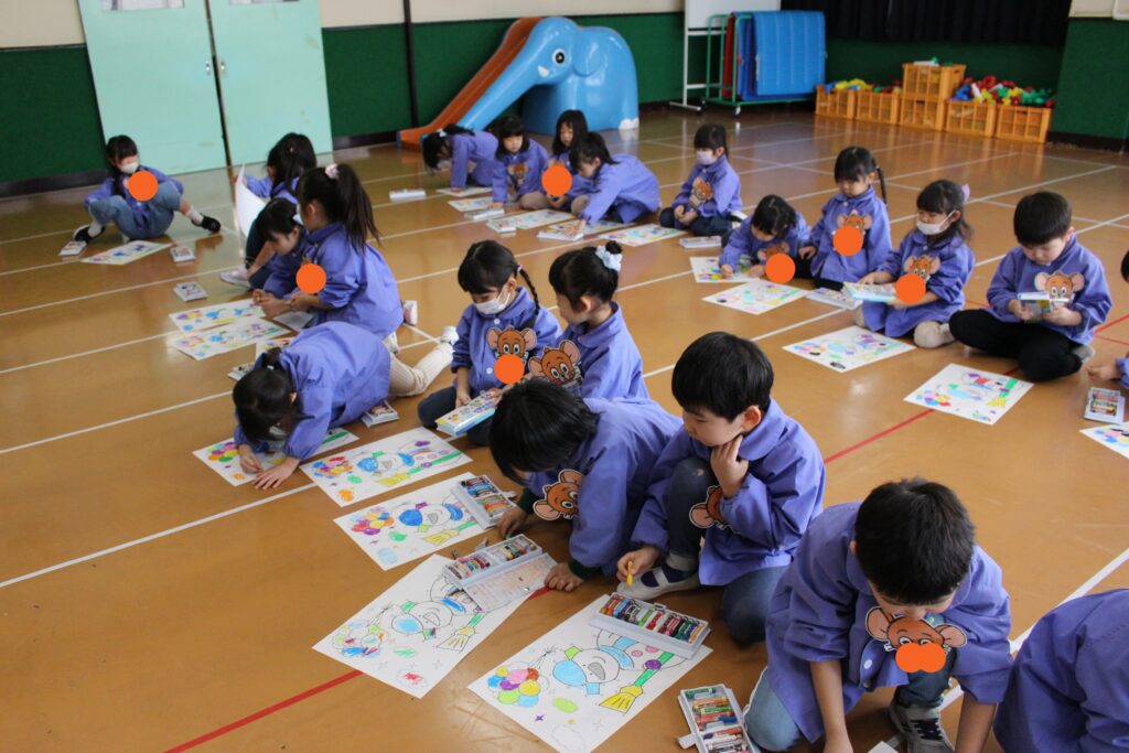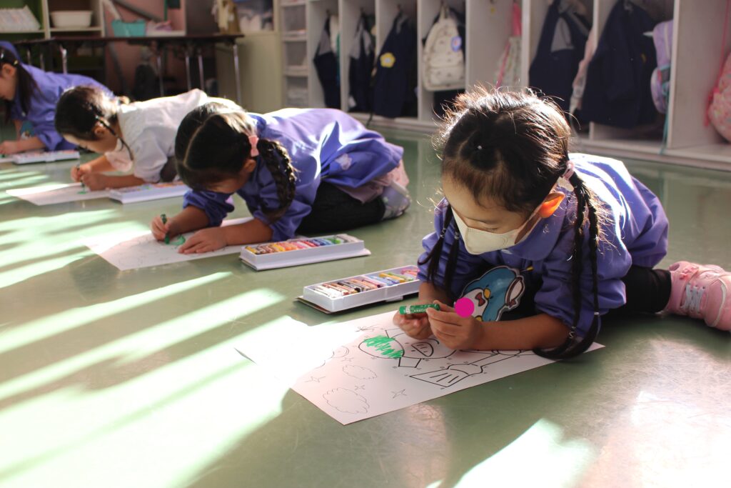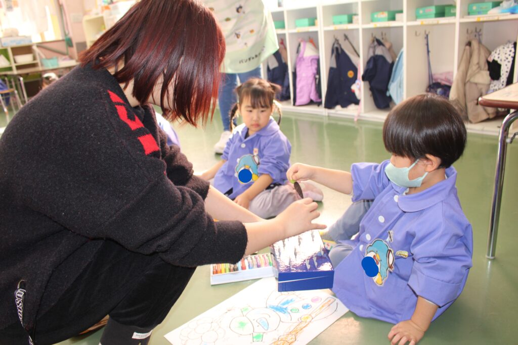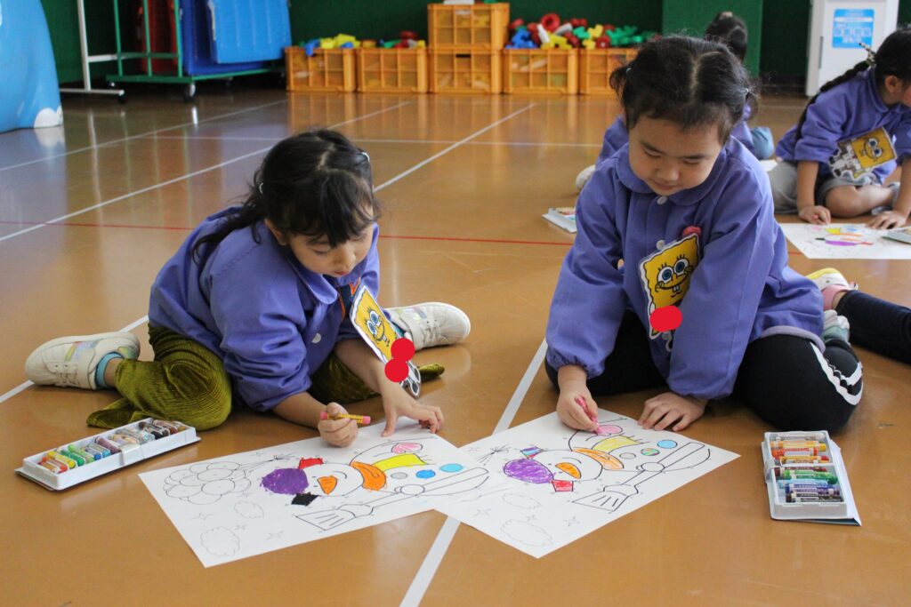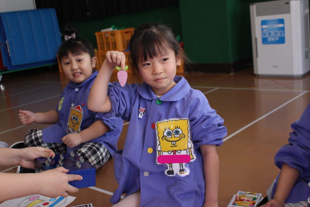 次に、みんなでクレヨンを使って塗り絵をしました🖍️くじ引きをし、出たニンジンの色のクレヨンを使って塗り進めます🖍️もちろん、出た色の中国語での発音も、講師の先生と一緒に確認していきます!