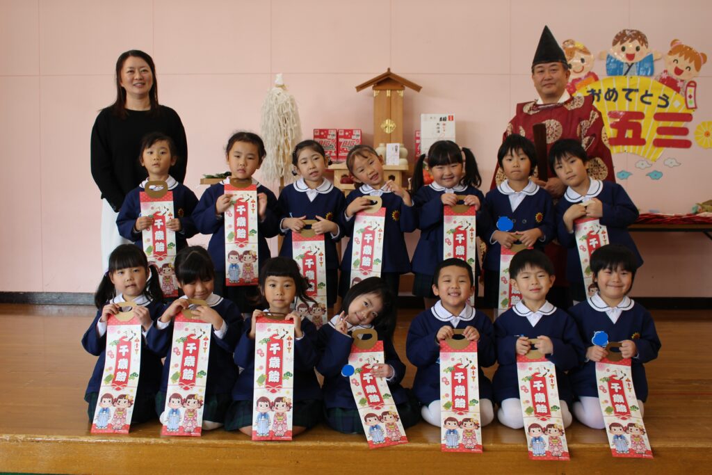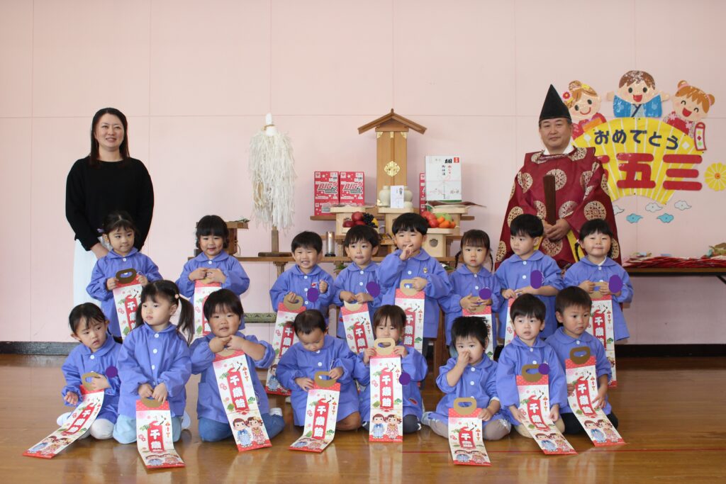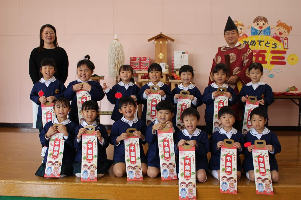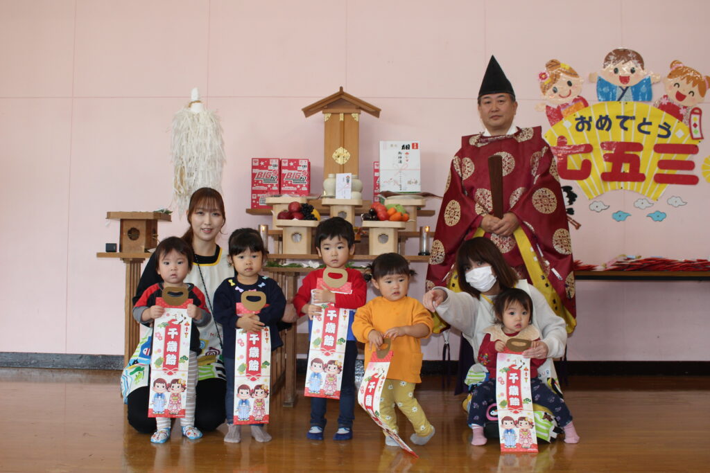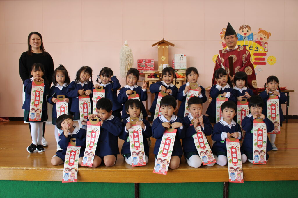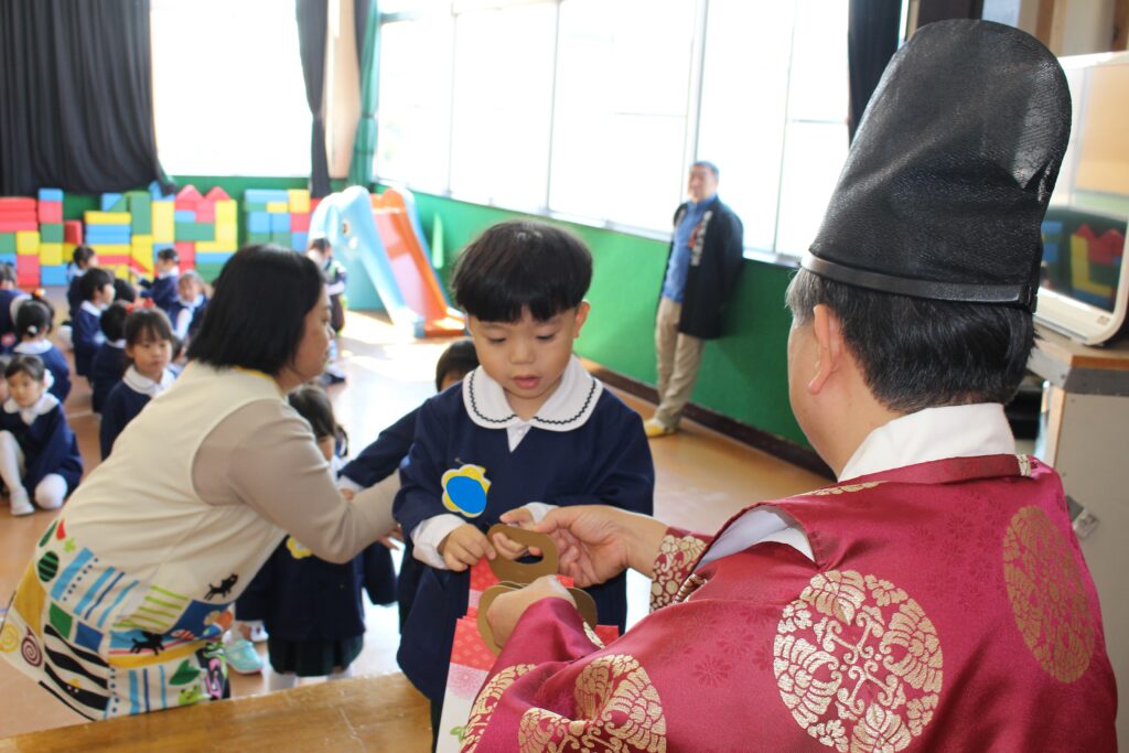 今年度は、川内八幡宮の宮司さんがひまわり幼稚園に来園し、七五三の御祈祷をしてくださいました。