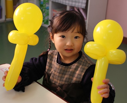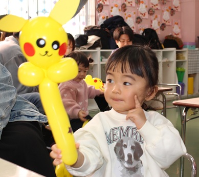 風船に空気を入れたらくるくるねじって…なかなか難しい❣何とか形を作れましたね。