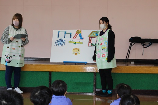 集会ではお外遊びのお約束を先生と一緒に確認しました。