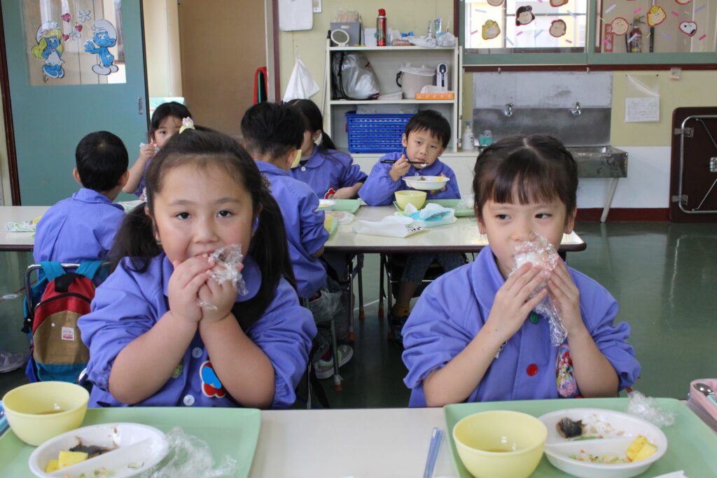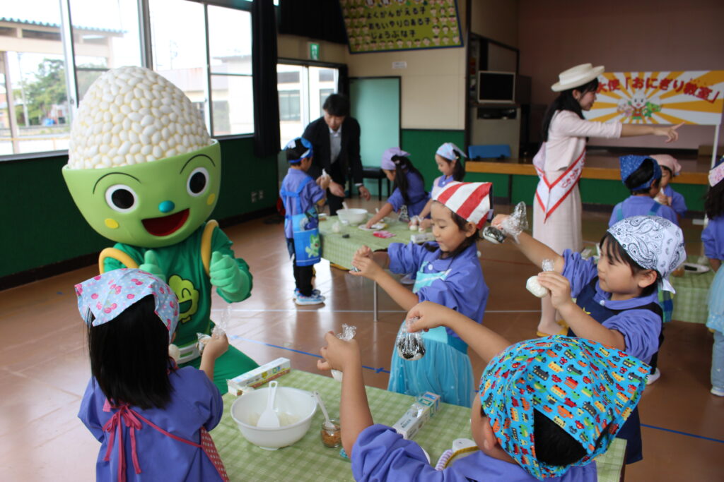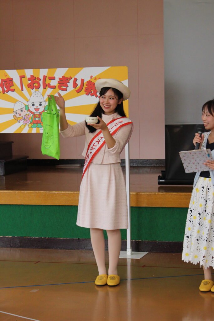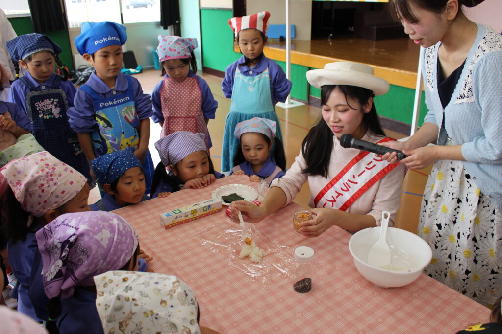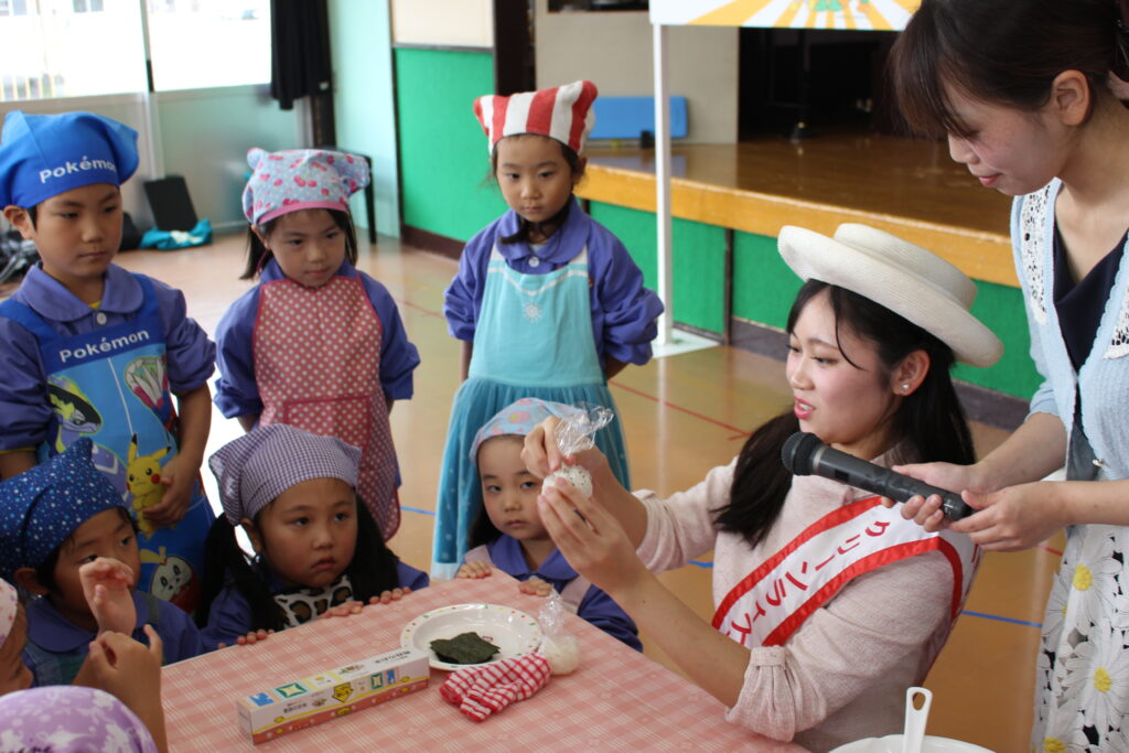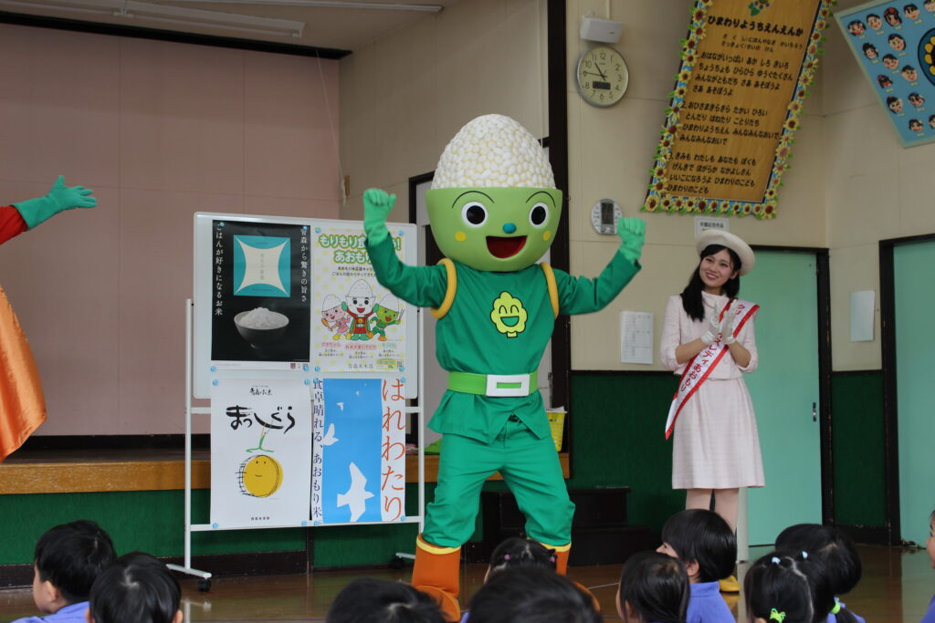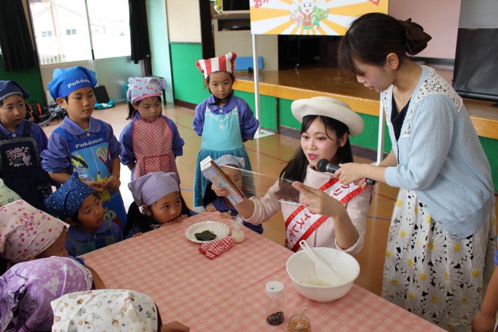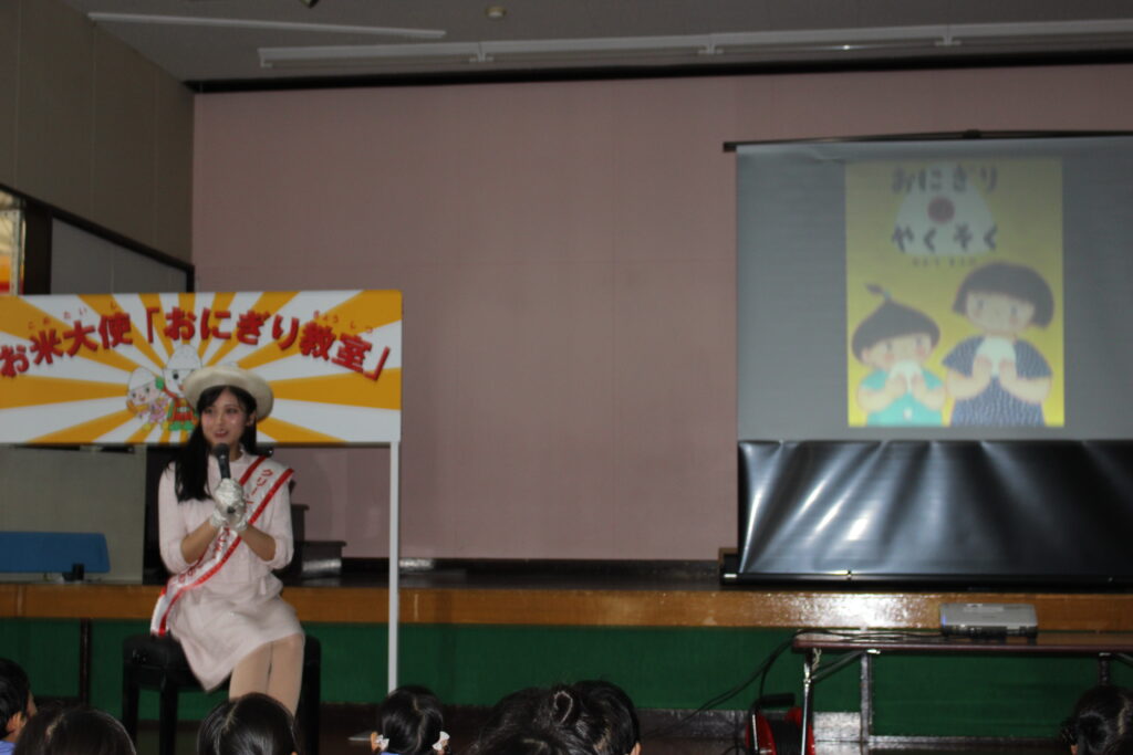 クリーンライスレディあおもりの中城さんに、クイズを出してもらったり、絵本「おにぎりのやくそく」を読んでもらったり、ごはんやお米、青森のおいしい食べ物についてお勉強しました。